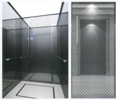 轎壁:后壁中間黑鈦金鏡面蝕刻兩側黑鈦鏡面不銹鋼,側壁黑鈦鏡面不銹鋼,底部黑鈦發(fā)紋不銹鋼踢腳線